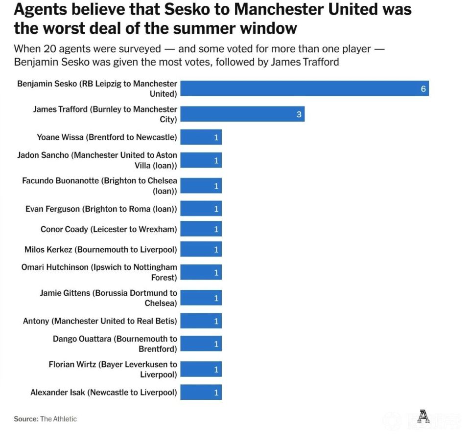 北京时间10月13日,权威媒体The Athletic 发布了2025年经纪人调查,该调查分析了这个创纪录的英超夏季转会窗口,本次调查邀请了20位经纪人回答相关问题。其中,在关于夏窗最差引援的评选中,曼联前锋谢什科拿到6票,成为得票最多的球员。而在夏窗最佳引援的评选中,曼城门将多纳鲁马拿到5票,排名第一。